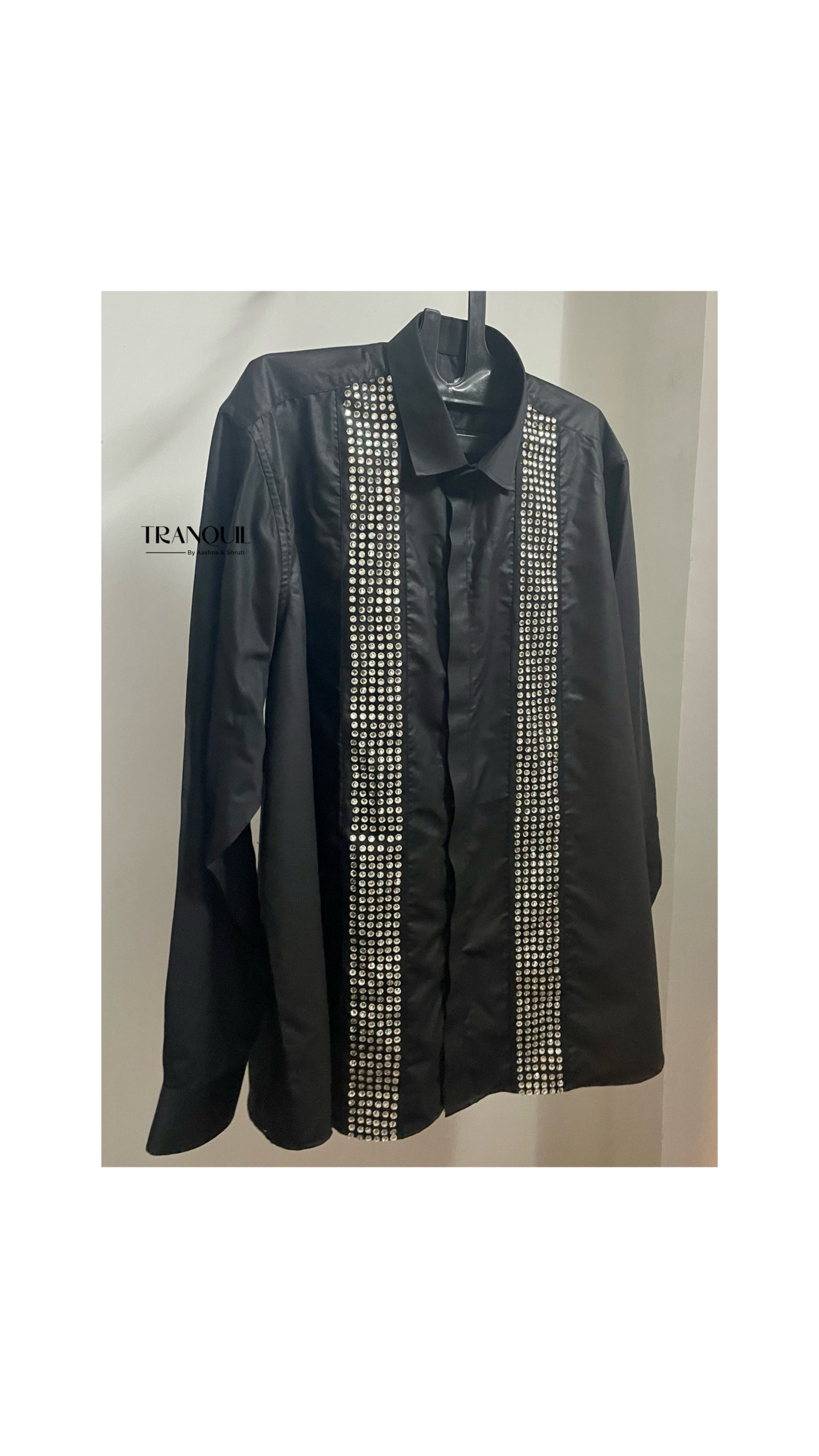 Lend posh style to your modern day wardrobe by investing in this black sparkly shirt.It is enhanced with a fiery hued embellished motif.